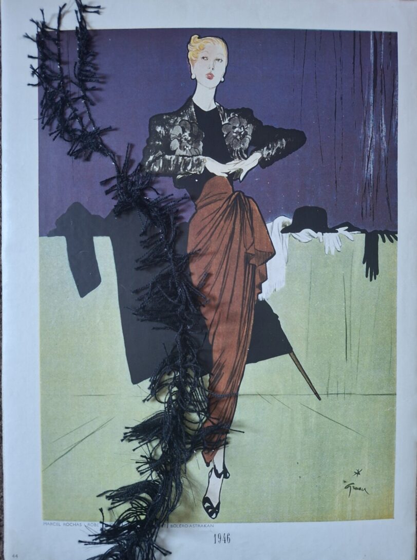 Modeentwurf aus den 1940iger…eine Farbenpracht…perfektes Designe , bestickt in Fransenoptik schwarz, 20x30cm