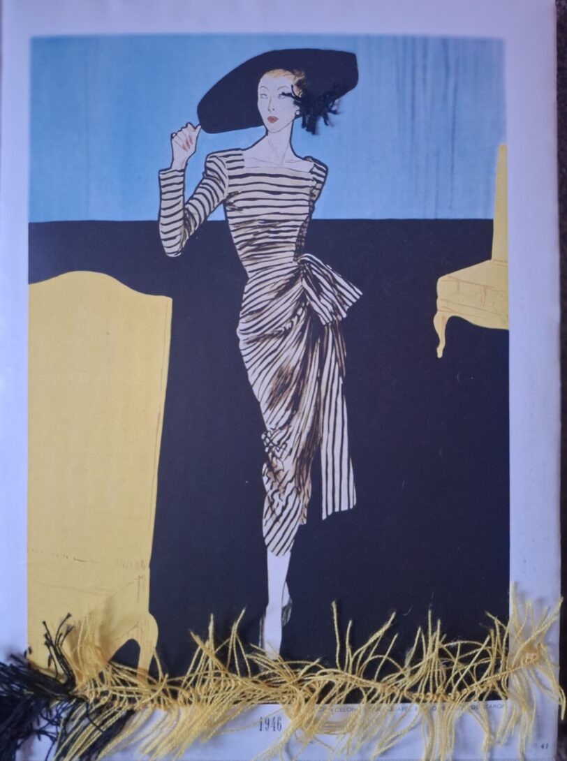 Modeentwurf aus den 1940iger…eine Farbenpracht…perfektes Designe , bestickt in Fransenoptik schwarz, 20x30cm