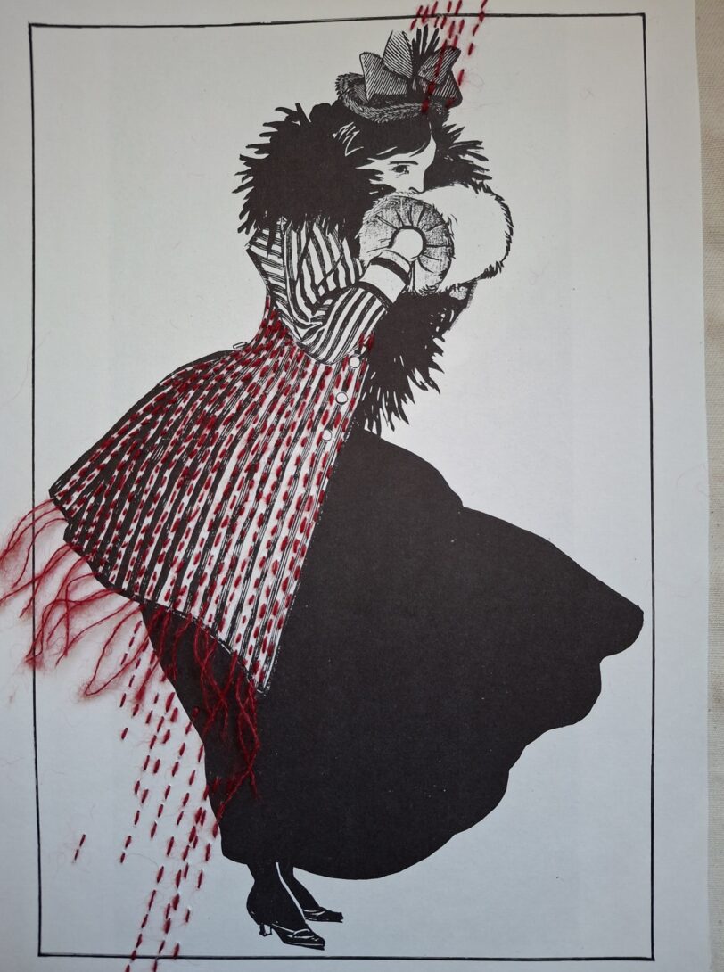 traumhaftes schwarz/weiß Blatt bestickt mit roter Mohairwolle…die Fransen wehen leicht im Wind, 21×32